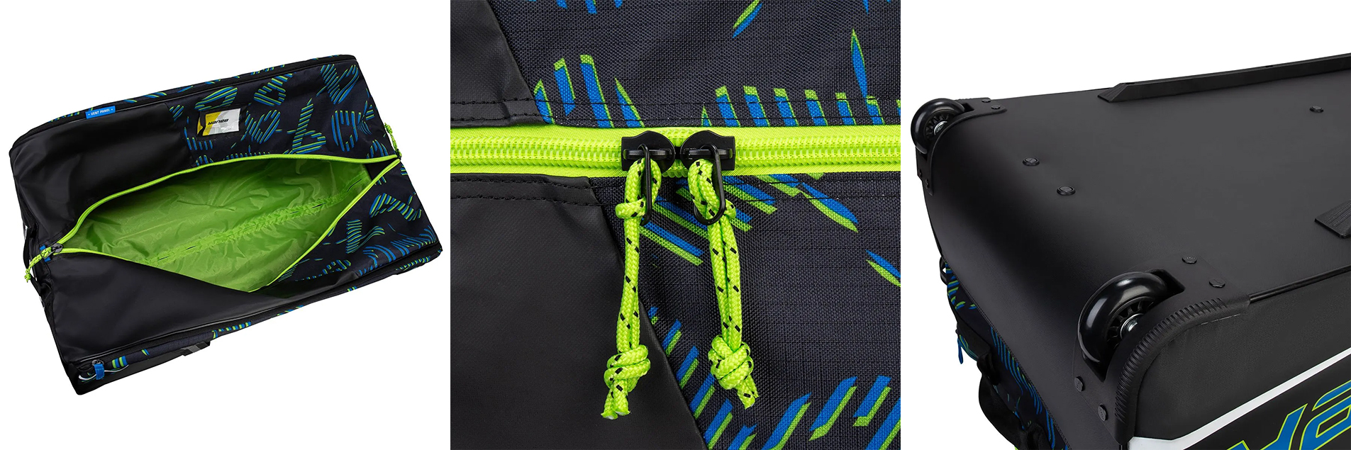 Внутри у баула просторное основное отделение, куда легко помещаются шлем, нагрудник, защита, шорты и форма, а по торцам расположены отдельные карманы для коньков, аксессуаров и белья, что помогает поддерживать порядок и ускоряет сборы перед тренировкой. Дополнительные вентиляционные панели способствуют лучшему высыханию амуниции и снижению запаха, а внешние карманы, включая отделение под бутылку, делают этот баул практичным и продуманным подарком для любого уровня игрока.
